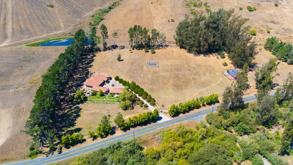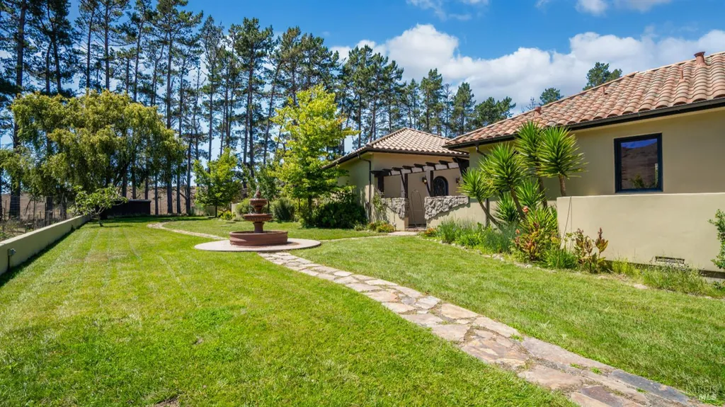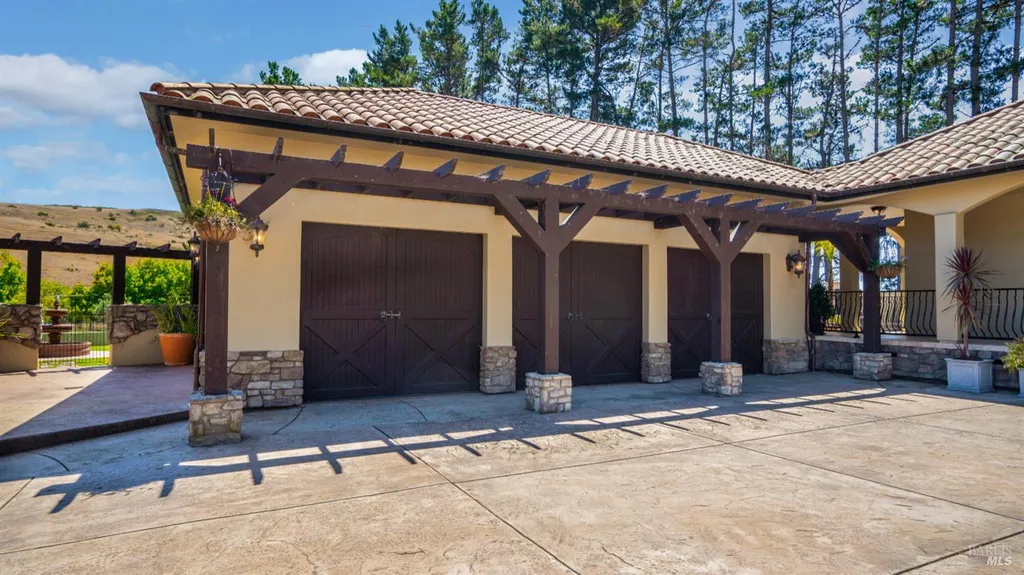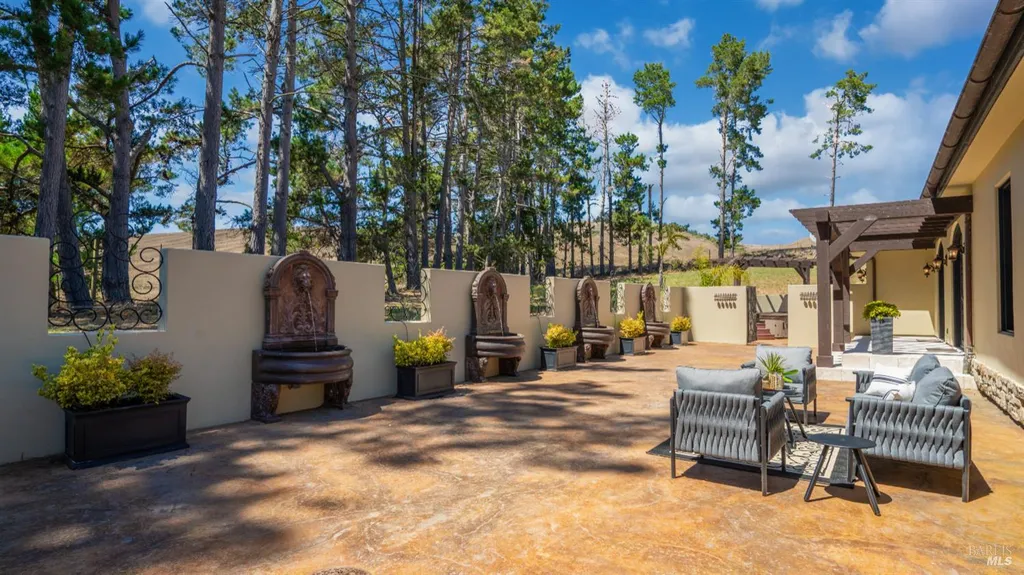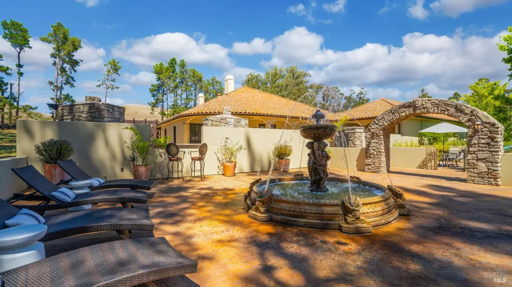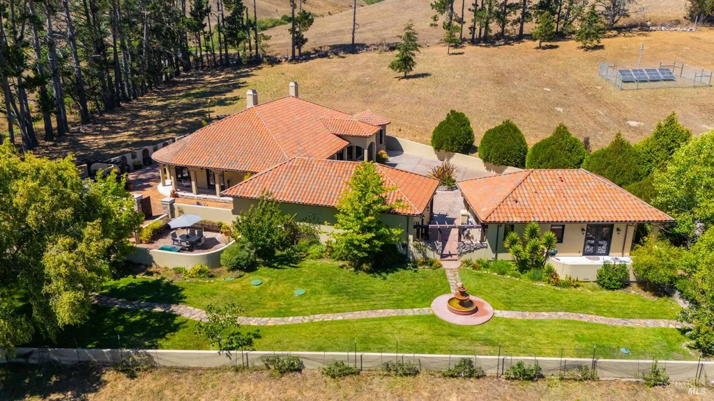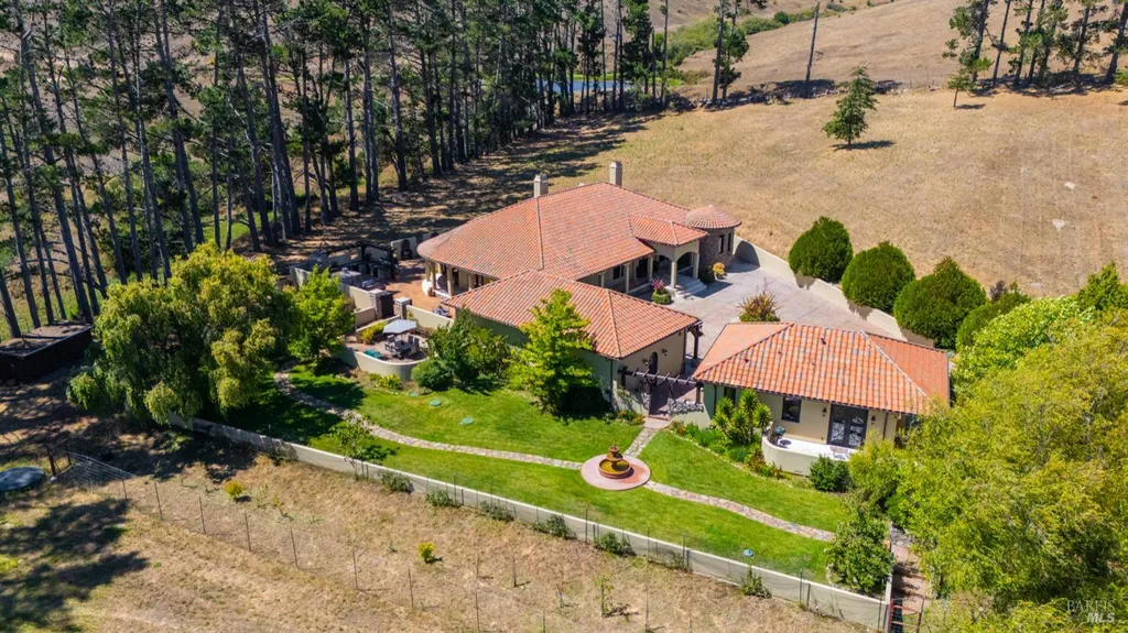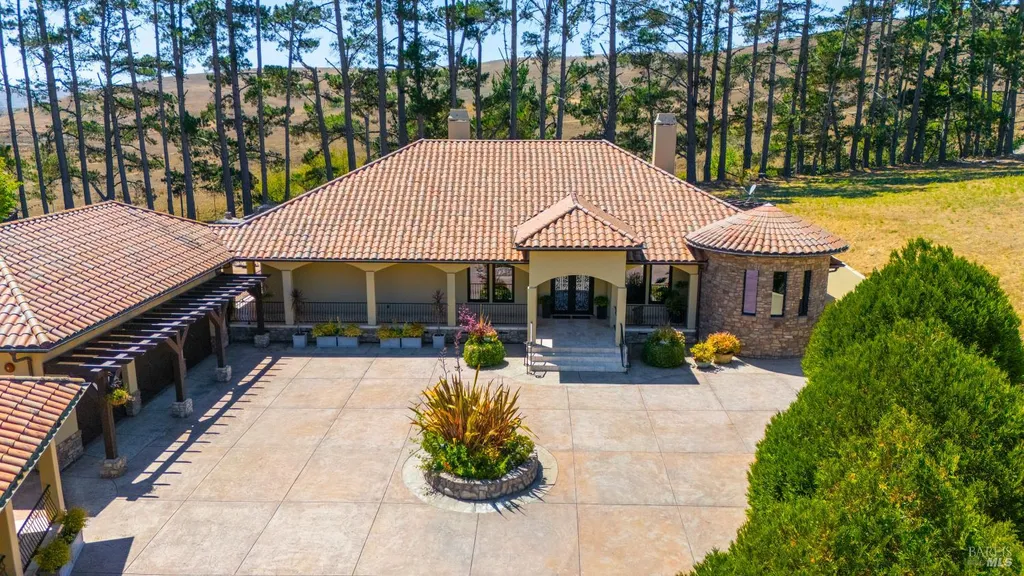 Discover an exquisite, gated Mediterranean-style estate nestled on 9 acres of serene Sonoma County countryside, minutes from Bodega's coastal charm and towns like Petaluma, Bodega Bay and Sebastopol. The property offers a luxurious retreat with sweeping views, privacy, and refined design, a dream for those seeking elegance and tranquility amidst rural beauty. The main residence, built in 2007, spans approximately 3,789 sq ft, featuring 4 bedrooms and 3.5 baths designed with intentional separation for privacy and comfort. The primary suite is strategically tucked away from the communal areas and boasts luxurious touches such as iron-framed doors and windows, and heated travertine flooring. A beautifully appointed 640 sq ft casita, crafted with the same Mediterranean elegance as the main home, offers a welcoming space for guests. The property includes an expansive 5,000 sq ft outdoor entertainment courtyard, complete with a fully equipped kitchen, an inviting outdoor fireplace, an authentic imported Italian pizza oven, and tranquil water features, perfect for al fresco gatherings and leisurely afternoons. Included is a classic two-story barn with 5 stalls, tack room and paddocks. Upstairs in the barn is unfinished space with electricity, offering endless possibilities.