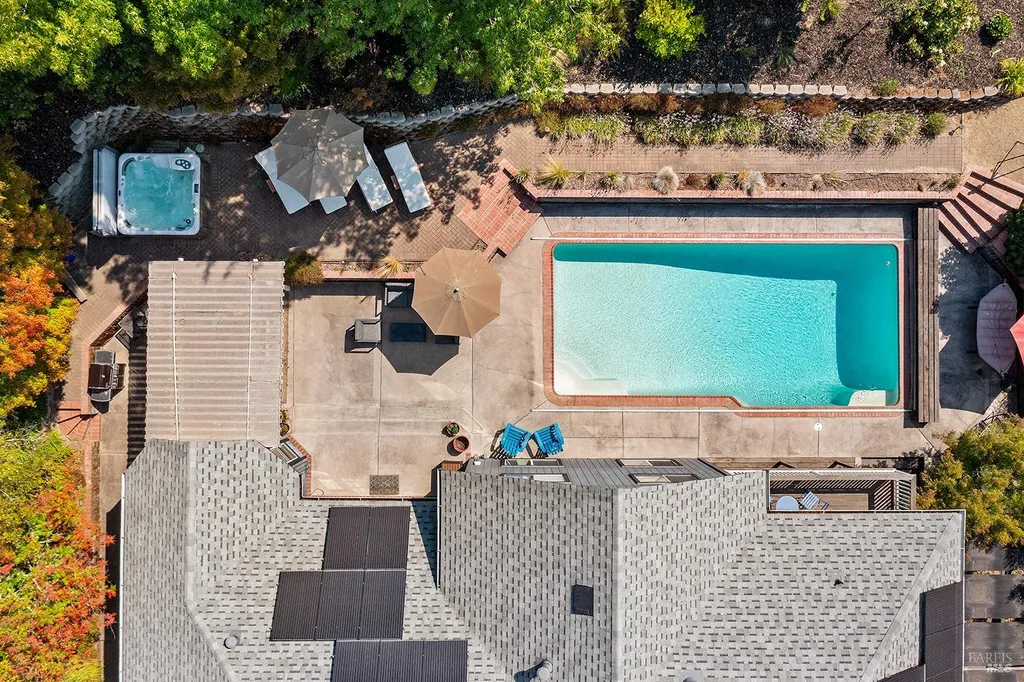 Immaculate 4-Bedroom Home with Resort-Style Amenities. Nestled at the end of a peaceful cul-de-sac, this expansive 4-bedroom, 2.5-bathroom home offers over 3,000 sq. ft. of living space on a private .45 acre lot. Featuring an open floor plan with soaring cathedral ceilings and large windows in each room, this home provides the perfect combination of comfort and style. The chef's kitchen is a highlight, equipped with high-end appliances and ample counter space, ideal for both cooking and entertaining. A versatile extra room offers endless possibilities, perfect as a home office, game room, or media space with radiant floor heating adding an extra touch of warmth and comfort. The backyard is an entertainer's dream, featuring a sparkling pool, hot tub, bocce court, butterfly gardens, and raised vegetable beds. Additional Features Include: 3-car garage, owned solar panels, Direct access to the Joe Rodota Trail, minutes from local restaurants, wineries, and the town of Graton. This beautifully maintained home offers privacy, luxury, and easy access to all that Sonoma County has to offer.